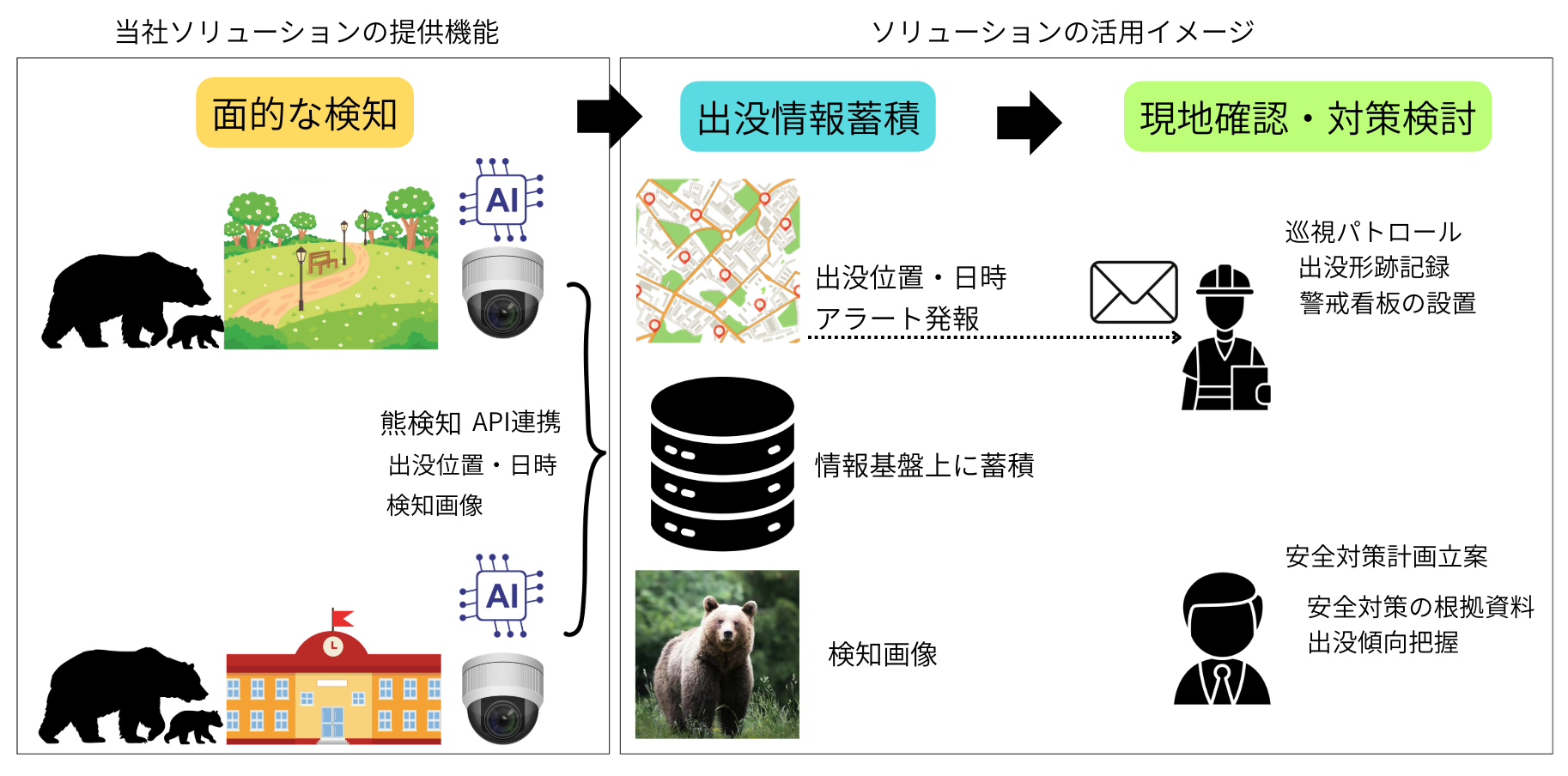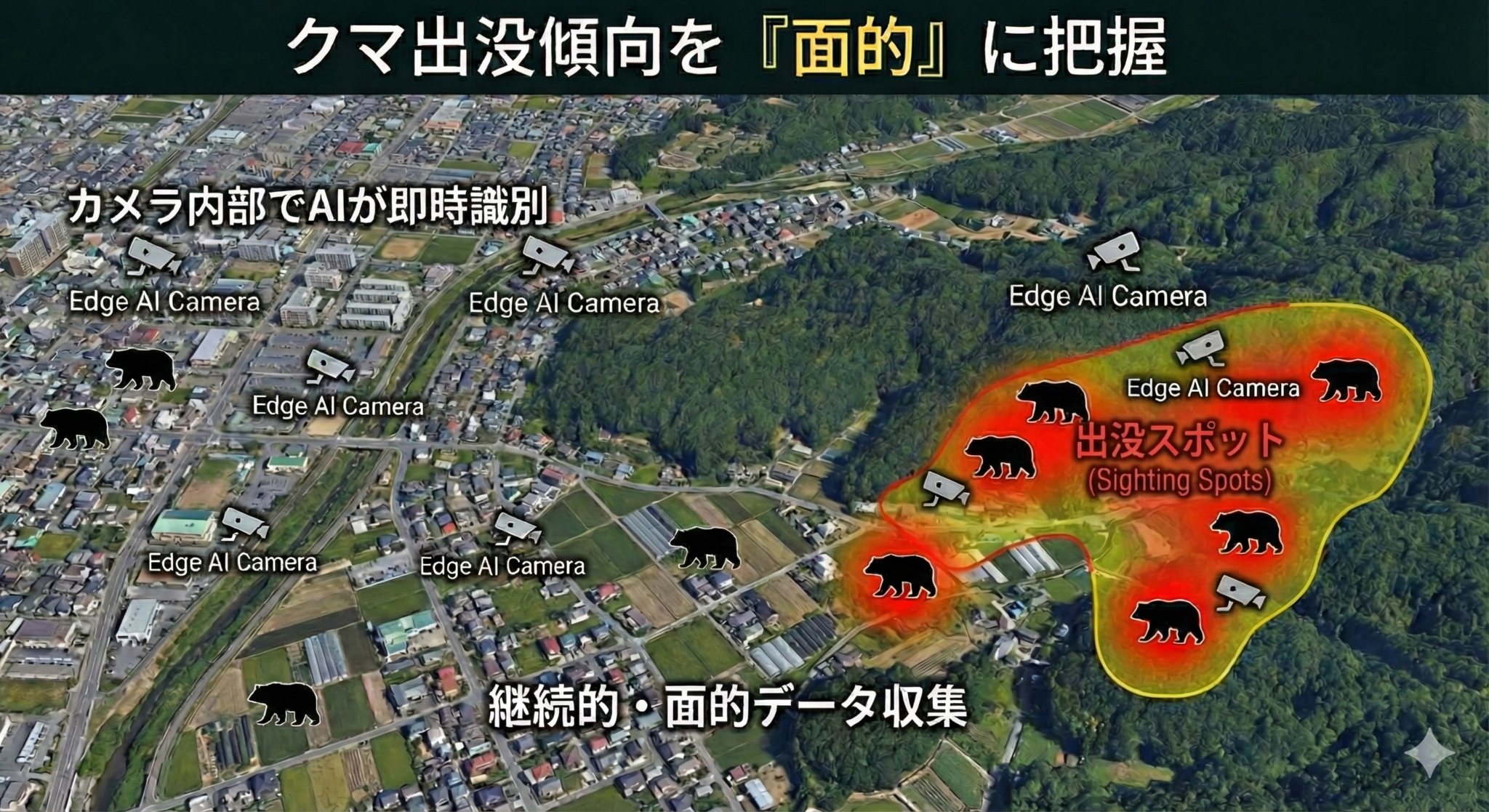 これに対し、国による『クマ被害対策パッケージ』が策定されるなど、全国的に対策強化が推進されているものの、多くの自治体の現場では限られた人員と予算での対応に苦慮しているのが現状です。また出没傾向を十分に把握できていないことから対策方針の策定が難しく、さらには誤検知によって、職員の無駄な出動や住民の不安を招く例も散見されており、結果としてパトロールや注意喚起、捕獲・誘導などの具体的かつ効果的な対策が後手に回ってしまう課題が生じています。