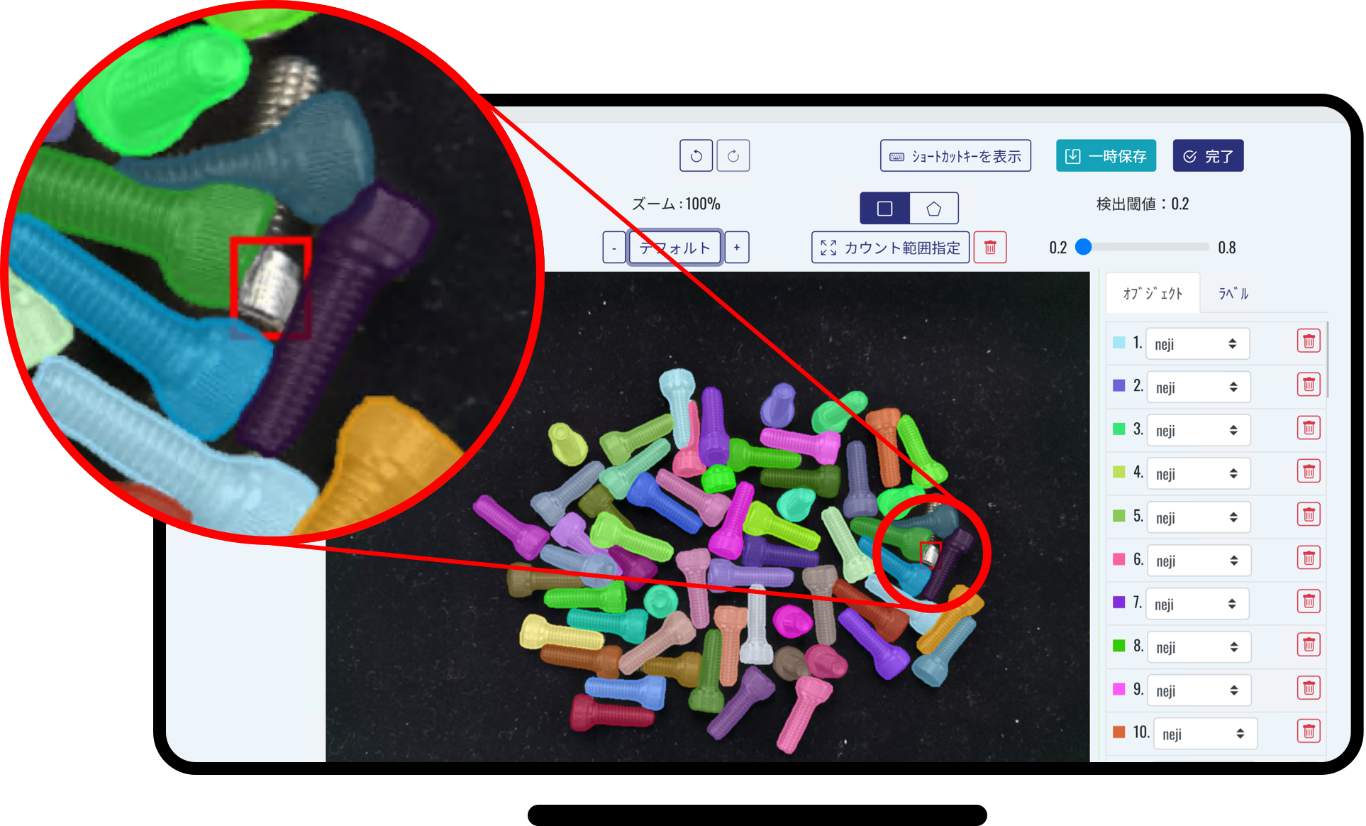 画像上の不定形物や様々な向きに置かれた物体を、スピーディかつ高精度でカウントできるAIソフトウェアです。袋に入ったネジの個数や、種類ごとのカウントなどを行うことが可能です。